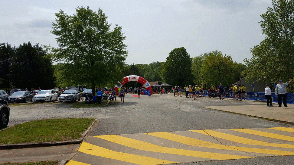 I ran up to the transition station and jumped into my bike shoes. I did not bother putting socks on and tried to be in and out as fast as I could. I had no problems clipping in my bike and was off. The 11 mile bike ride went through the entire park. The one thing I regret not having was sun glasses. The pollen, dirt and bugs started getting to me and I had to keep looking down at the road to protect my eyes.