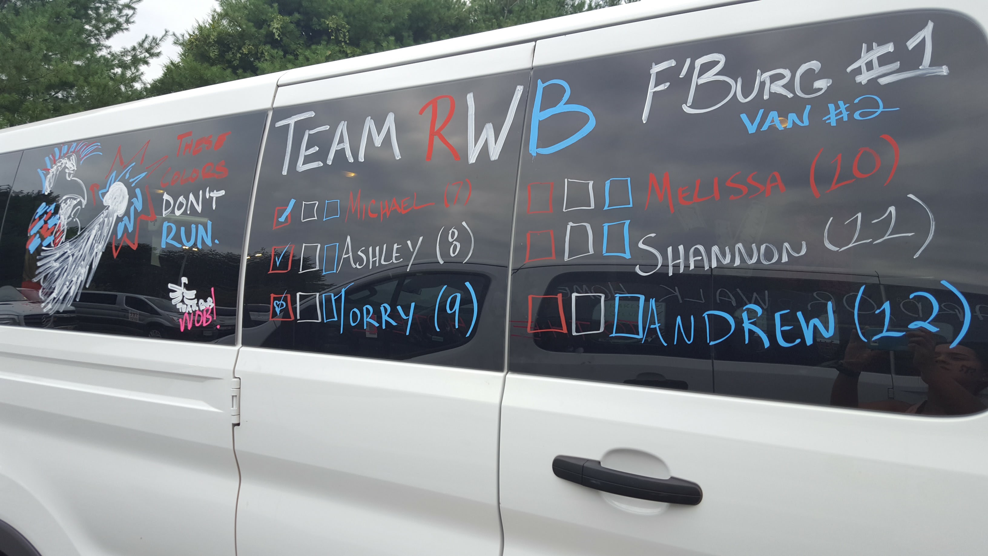 Communication between both vans is key when running this event! Picture above is Van 2. We decorated our Van to keep track of our legs.