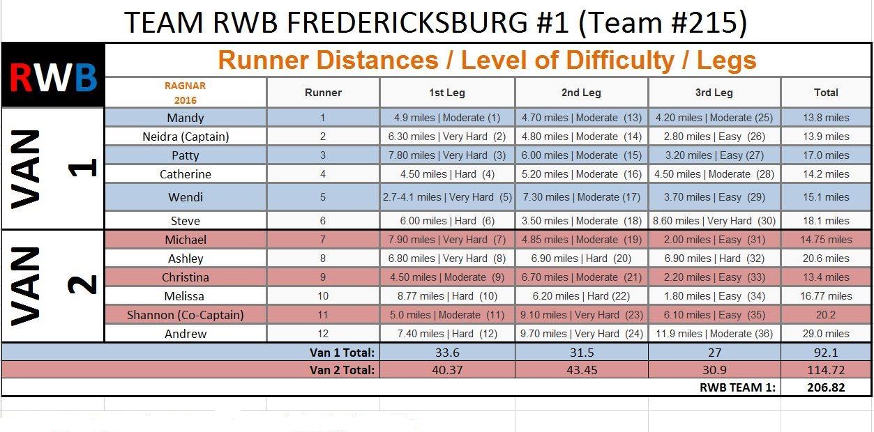 Now how exactly do we run a 200ish mile relay race as a team? It is very strategically planned and well thought out. The course runs from Cumberland, Maryland all the way down to Washington D.C. Teams are divided into two separate vans. The first 6 runners are in Van 1 while runners 7 through 12 are in Van 2. For my team I was runner 8 so I was in Van 2. You can see the strategic breakdown below.